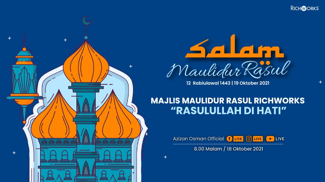Assalamualaikum dan Salam Sejahtera "Allahumma sholli 'ala Muhammad wa 'ala ali Muhammad." - "Ya Allah, berikanlah rahmat-Mu kepada junjungan kami Nabi Muhammad dan keluarga Nabi Muhammad." Bersempena dengan bulan kelahiran Nabi Muhammad SAW, Kami dari RichWorks International ingin menjemput anda, ahli keluarga anda serta rakan - rakan anda yang lain untuk mengimarahkan lagi Majlis Maulidur Rasul RichWorks "Rasulullah Di Hati" secara besar - besaran bersama kami pada tahun ini. Pastikan anda set reminder untuk turut serta bersama kami pada 18 Oktober 2021 (Isnin) ini jam 8.00 malam untuk tonton secara LIVE di semua platform Azizan Osman Official dan Facebook Page Official Azizan Osman. Semoga dengan apa yang kita lakukan ini mendapat satu rahmat dan syafaat di dunia dan di akhirat serta mampu menambahkan lagi kecintaan dan kerinduan kita terhadap junjungan besar Nabi Muhammad SAW. Amin Ya Rabb.