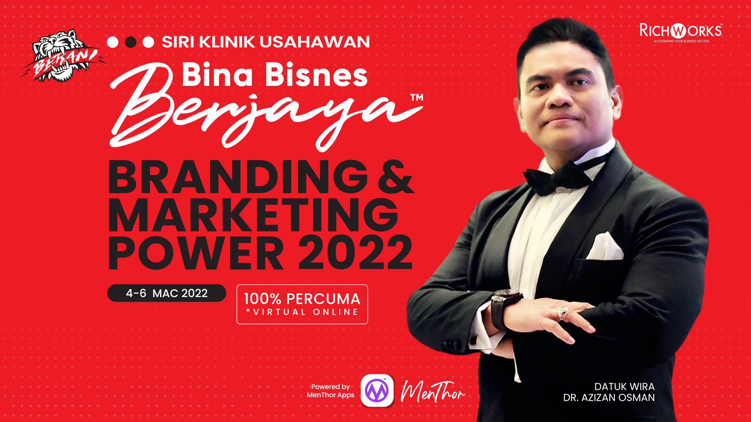 Massive Action Creates Massive Results! "Branding & Marketing Power adalah kunci kepada Sales anda jadi 10X ganda!" – Datuk Wira Dr. Azizan Osman Untuk sebarang pertanyaan, anda boleh berhubung melalui whatsapp atau hubungi Pegawai Khidmat Pelanggan kami di