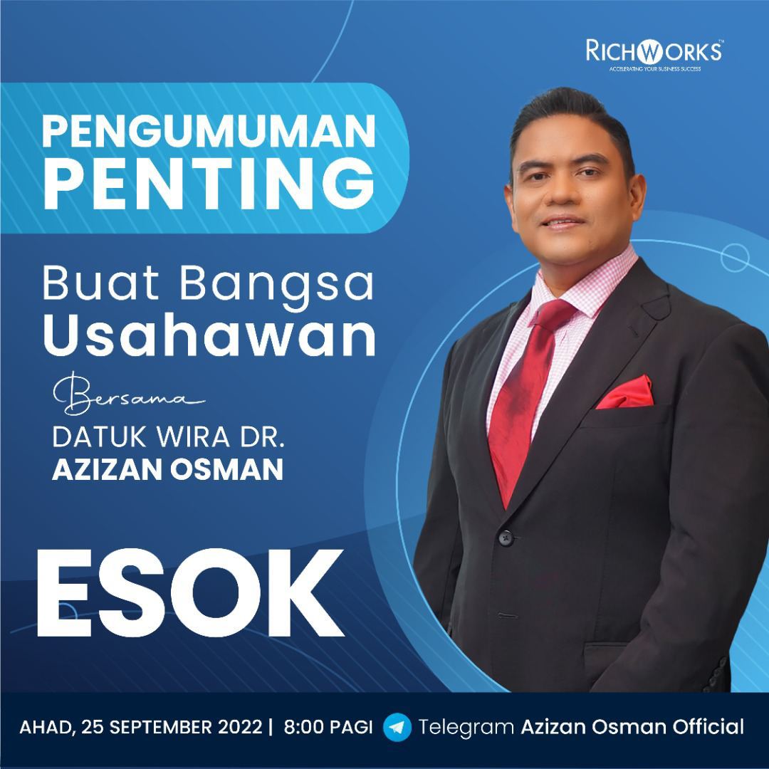 Cabaran bagi bisnes ketika ini, its real. Bukan nak menakutkan tapi ia sedang berlaku kepada usahawan-usahawan di luar sana. Tanpa persediaan yang betul, disusuli tindakan agresif akan buatkan anda terus stuck dan boleh terus jatuh lagi. Sebab itu, alluser kena ikuti perkongsian Mentor Usahawan, Datuk Wira Dr. Azizan Osman esok, pukul 8 pagi di Telegram Azizan Osman Official. Ini mesej khas Dr. Azizan buat alluser, bangsa usahawan yang mengikuti RichWorks. | |