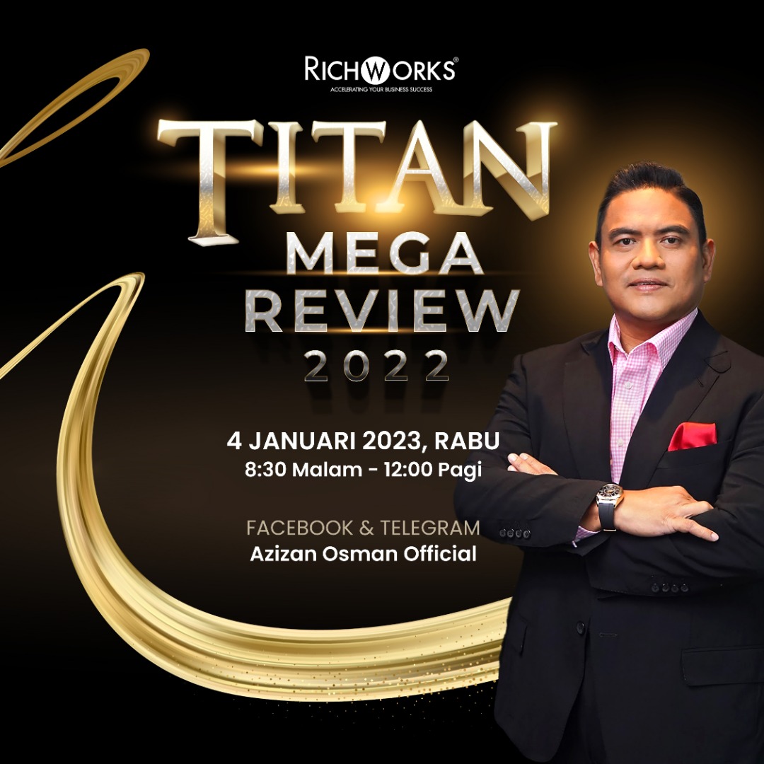 Salam Usahawan alluser, Pencapaian usahawan bimbingan RichWorks pada tahun 2021 kita dah tahu, untuk tahun 2022 pula bakal diumumkan malam esok secara Live dalam Titan Mega Review 2022. Yang lebih istimewa, Datuk Wira Dr. Azizan Osman sendiri akan umumkan Top 100 daripada lebih 300 Usahawan Jutawan Titanium RichWorks. Usahawan boleh berjaya dalam bisnes, tapi dengan adanya bimbingan anda boleh gandakan kejayaan itu. Mereka yang berada di dalam Program Mentoring RichWorks mendapat bimbingan yang intensif bagi menyiapkan persediaan awal bagi menghadapi 2023. Dalam cabaran pasti ada peluang dan mereka ada certainty serta kepastian untuk merebut peluang yang ada. Di tahun 2023 dan seterusnya, siapa nak berjalan seiring dengan Usahawan Jutawan RichWorks atau nak buat lebih lagi? Anda dijemput untuk tonton Titan Mega Review 2022 ESOK, Rabu, 4 Januari 2023 jam 8:30 malam secara LIVE di Facebook dan Telegram Azizan Osman Official. Topik: Bagaimana Usahawan Bimbingan RichWorks Berjaya Grow Bisnes dan ada yang berjaya Capai Jualan tahunan RM100 Juta ke atas pada Tahun 2022? Jangan lepaskan peluang ini untuk belajar sendiri dari usahawan jutawan berjaya. | |