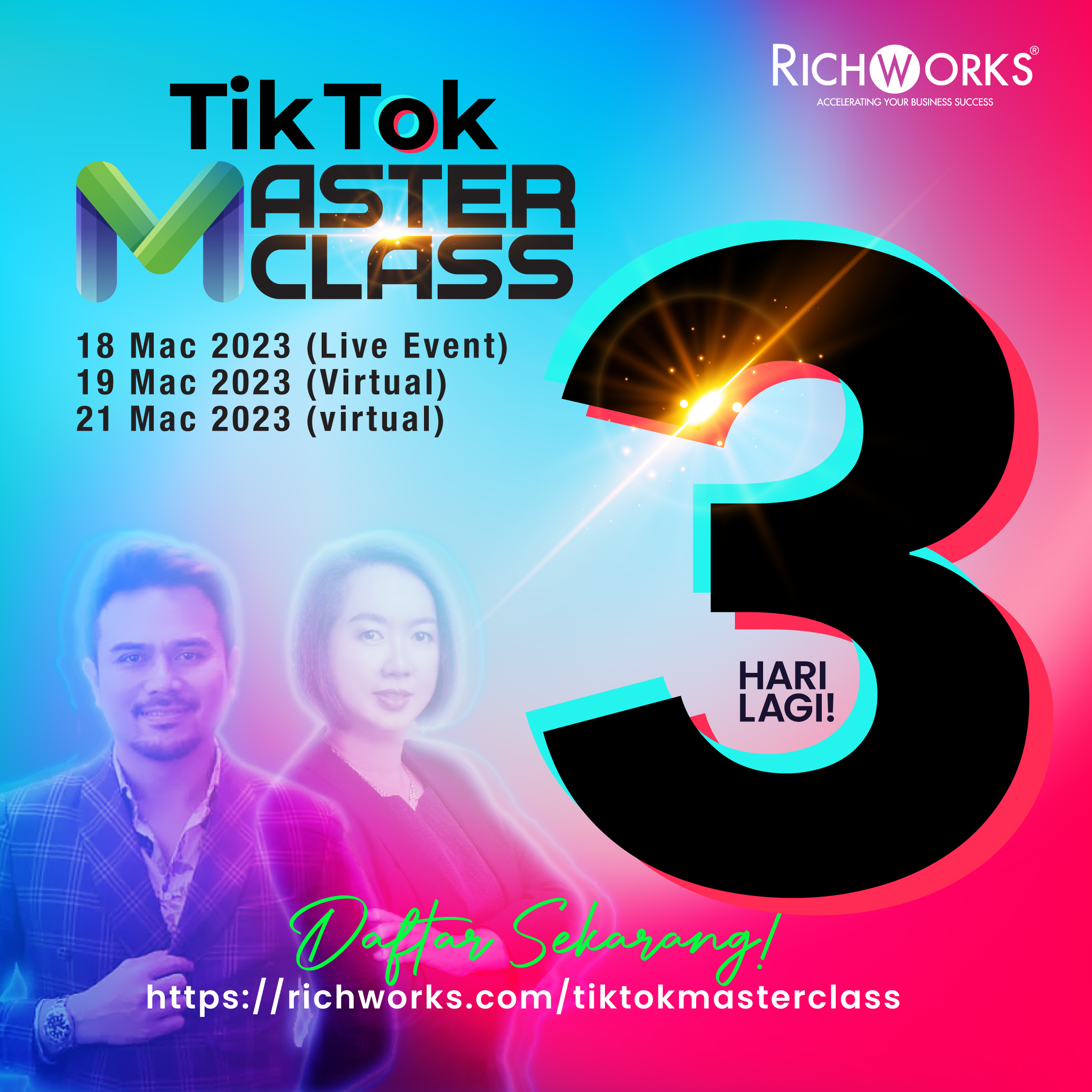 Salam alluser, Statistik terkini tahun 2023, ada seramai 34.13 juta populasi dalam Malaysia. 51.1% daripadanya adalah lelaki dan 48.9% adalah wanita. Daripada jumlah tersebut, seramai 26.8 juta adalah pengguna sosial media di Malaysia. Dalam bisnes tak ada istilah cepat atau lambat. Selagi ada manusia, pasti akan ada masalah. Tugas kita sebagai usahawan untuk bantu selesaikan masalah mereka menggunakan produk kita. Cuba tanya diri alluser sendiri, kenapa anda masih rasa sukar nak buat sales melalui TikTok? Pasti ada penyelesaiannya. Dan cara yang lebih berkesan. Jadi kami menjemput anda untuk hadir ke Program TikTok Masterclass yang akan berlangsung pada 18, 19 & 21 Mac ini untuk lebih faham tentang ilmu TikTok. | |