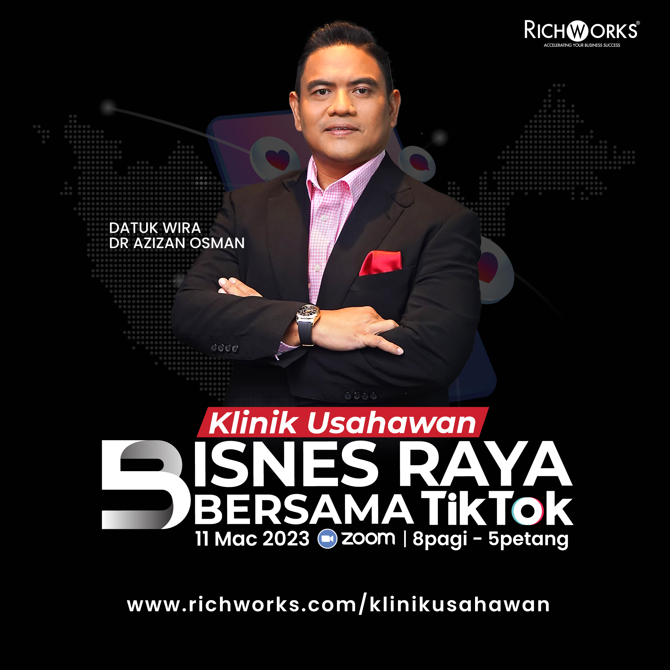 Sebab itu, RichWorks International akan adakan Klinik Usahawan: Bisnes Raya Bersama TikTok pada 11 Mac 2023, menerusi platform ZOOM, dari 8 pagi hingga 5 petang.