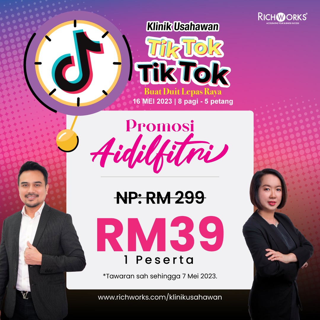 Maka RichWorks nak terus sokong anda dengan Klinik Usahawan Tik Tok Tik Tok, Buat Duit Lepas Raya pada 16 Mei 2023 secara virtual ZOOM online dari 8 pagi hingga 5 petang.