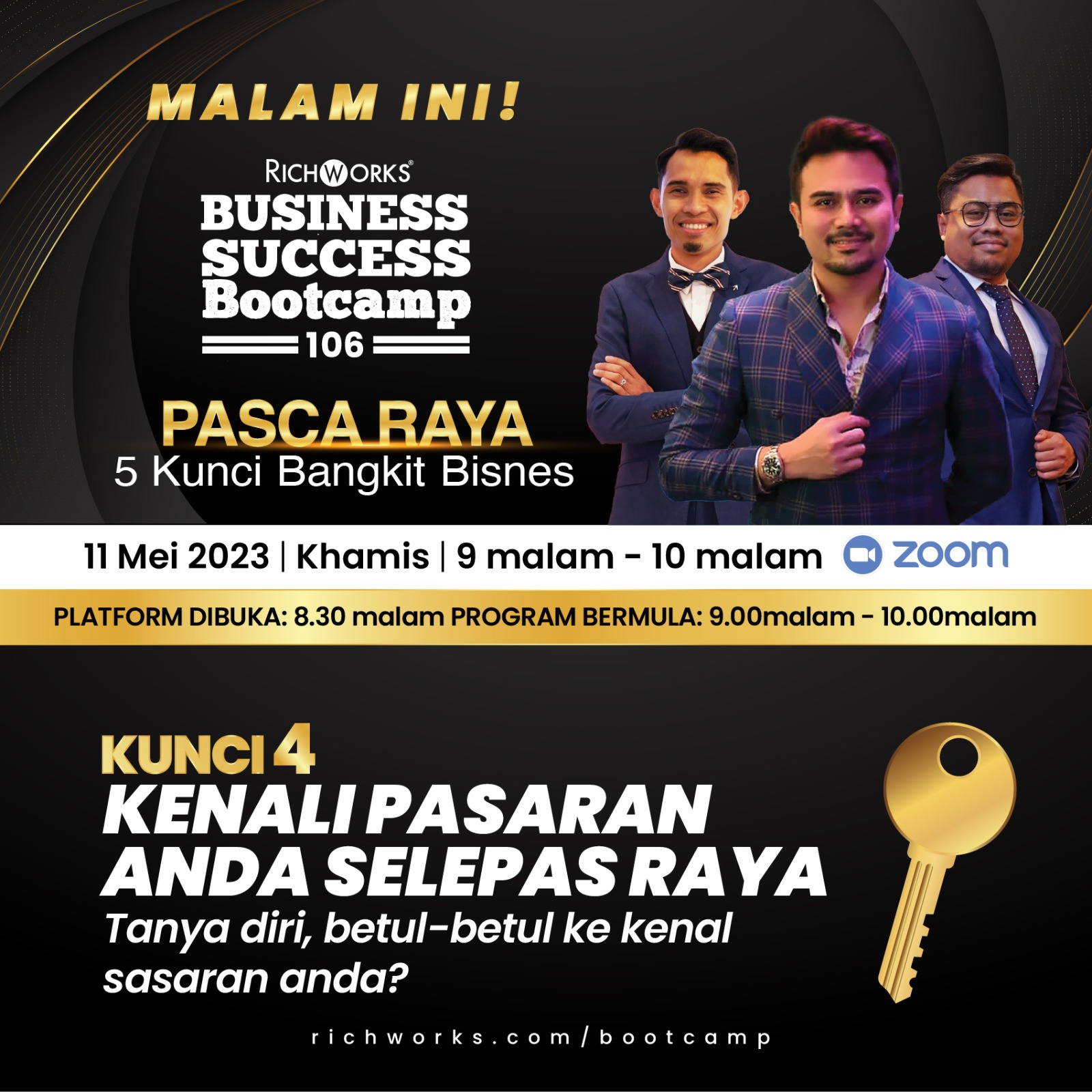 Salam sejahtera alluser, Bagi yang dapat untung bisnes ketika Ramadan, alhamdulillah. Tapi ada juga peniaga yang hampir mengalirkan air mata dek kerana modal pun tak lepas. Macam mana nak kenali pasaran anda selepas raya? Kita perlu strategi pemasaran yang berkesan untuk sasaran yang tetap! Tak mahu buang masa pada sasaran yang salah? Jangan lepaskan peluang untuk buka Kunci 4: Kenali Pasaran Anda Selepas Raya. Apa lagi, jom luangkan sedikit masa dari 9 hingga 10 malam dalam Business Success Bootcamp 106: Pasca Raya berbaki 2 hari lagi. Anda boleh sertai program ini dengan mudah menerusi platform ZOOM saja! Cepat klik link di bawah untuk pendaftaran sementara masih dibuka. | |