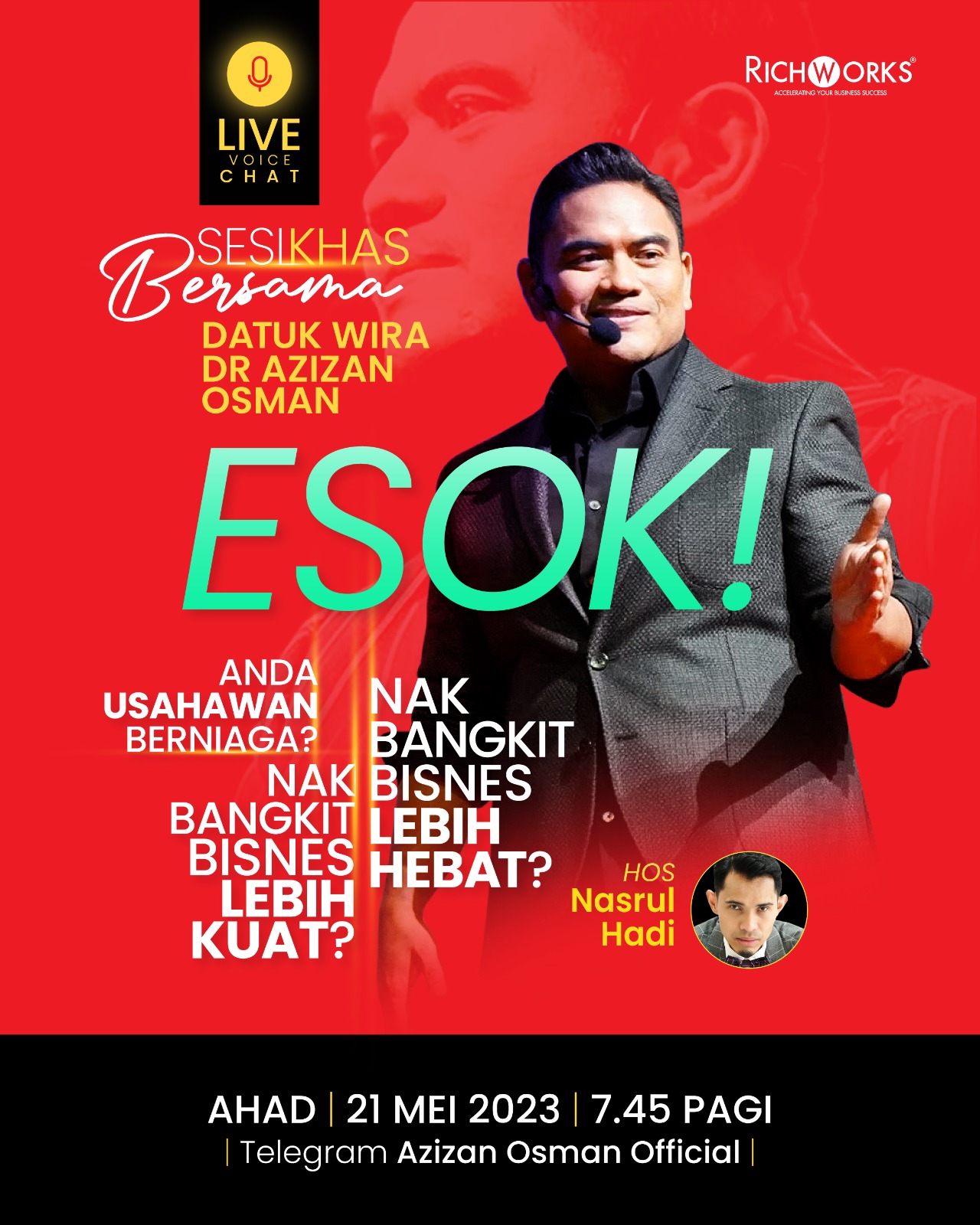 Sasaran baru akan sentiasa muncul kerana dunia ini penuh masalah. Di mana ada orang di situ ada masalah, di mana ada masalah di situ ada peluang. Peniaga yang bijak mampu mengintai peluang dan bersikap observant atau peka dengan perubahan sekeliling. Nak tahu apa yang berlaku dan terkini? Jangan lepaskan peluang untuk bersama Mentor Usahawan Datuk Wira Dr. Azizan Osman dalam sesi khas live voice chat. Sesi ini akan bermula pada jam 7.45 pagi di Telegram Azizan Osman Official. | |