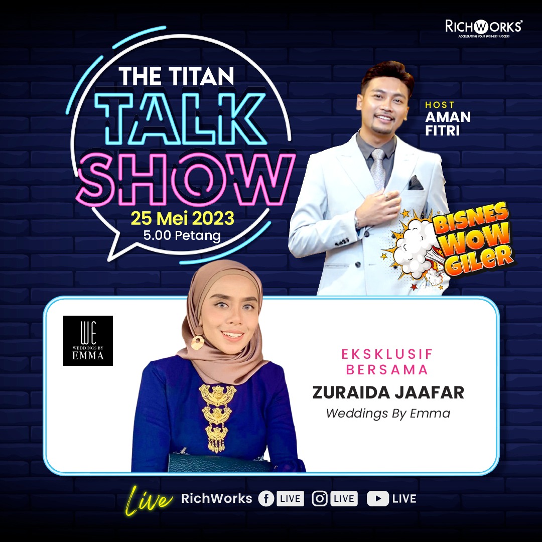 Jom saksikan Puan Emma di The Titan Talk Show hari ini jam 5 petang di Facebook, Instagram dan YouTube Channel RichWorks.