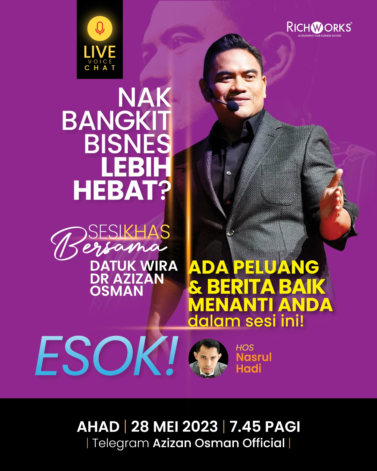 Salam sejahtera alluser, Selepas penat bekerja, hari minggu memang dinantikan. Tapi buat bangsa usahawan hari minggu mungkin kerjanya lagi berganda. Waktu ini pelanggan akan keluar window shopping atau mencari barang keperluan. Dalam kesibukan urusan seharian, pagi esok anda jangan terlepas pengumuman penting daripada Mentor Usahawan, Datuk Wira Dr. Azizan Osman. Pastikan sertai Sesi Khas Bersama Datuk Wira Dr. Azizan secara live voice chat di Telegram Azizan Osman Official pada 7.45 pagi, Ahad ini. Jangan terlepas ilmu dan pengumuman penting yang dapat SOKONG BANGSA USAHAWAN saat ini! Rugi jika ketinggalan. | |