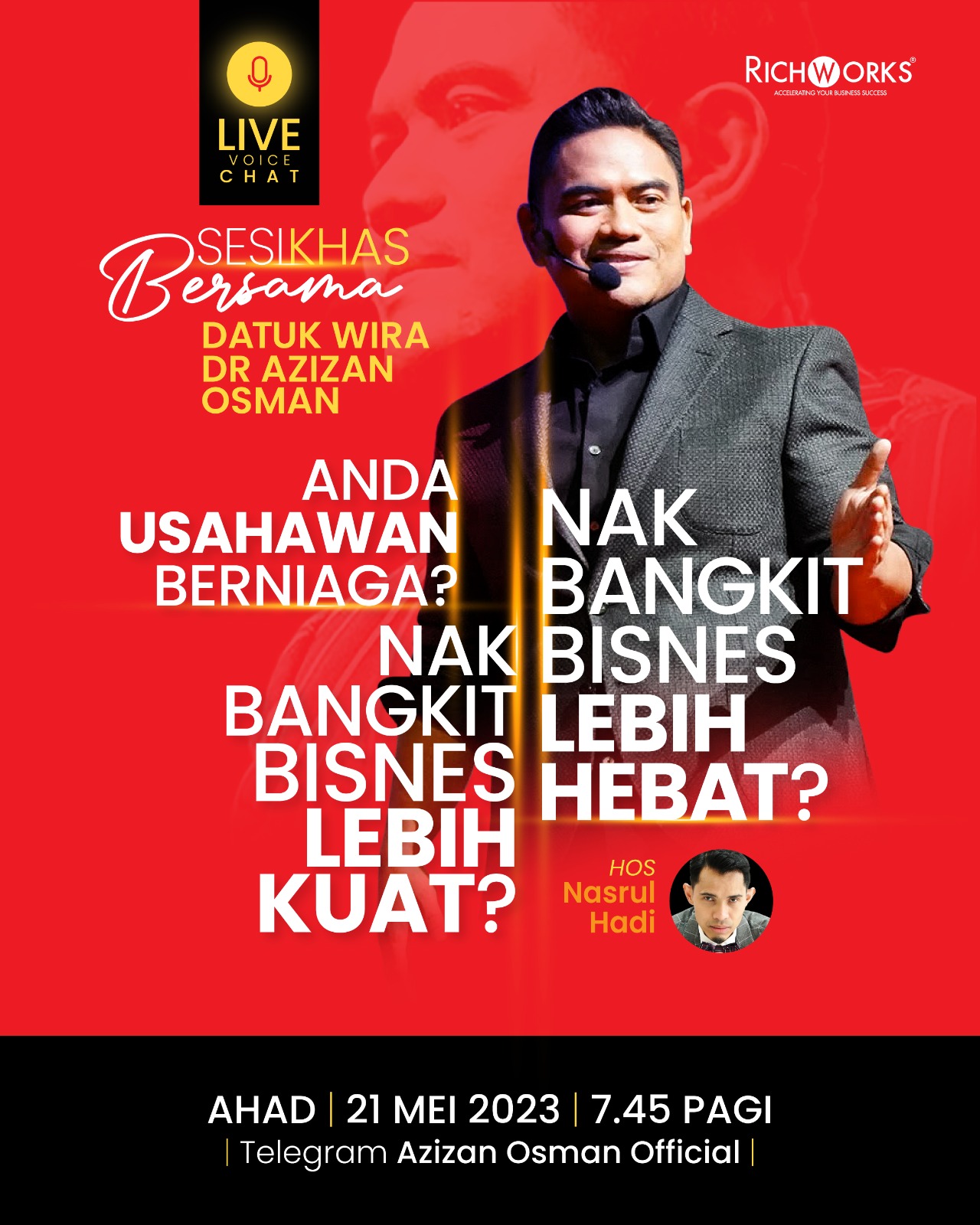 Salam sejahtera alluser, Hari ini nak jadi individu yang early bird atau night owl? Dalam bisnes, early bird selalu dapat banyak kelebihan dulu berbanding night owl. Jadi, apa kata hari ini alluser pilih jadi individu early bird. Tak rugi! Sebab Mentor Usahawan Datuk Wira Dr. Azizan Osman akan kongsi input terbaru untuk bangsa usahawan grow bisnes dalam sesi khas live voice chat ini. Selepas solat Subuh dan sarapan, kita terus tunggu sesi ini yang akan bermula pada 7.45 pagi di Telegram Azizan Osman Official. | |
