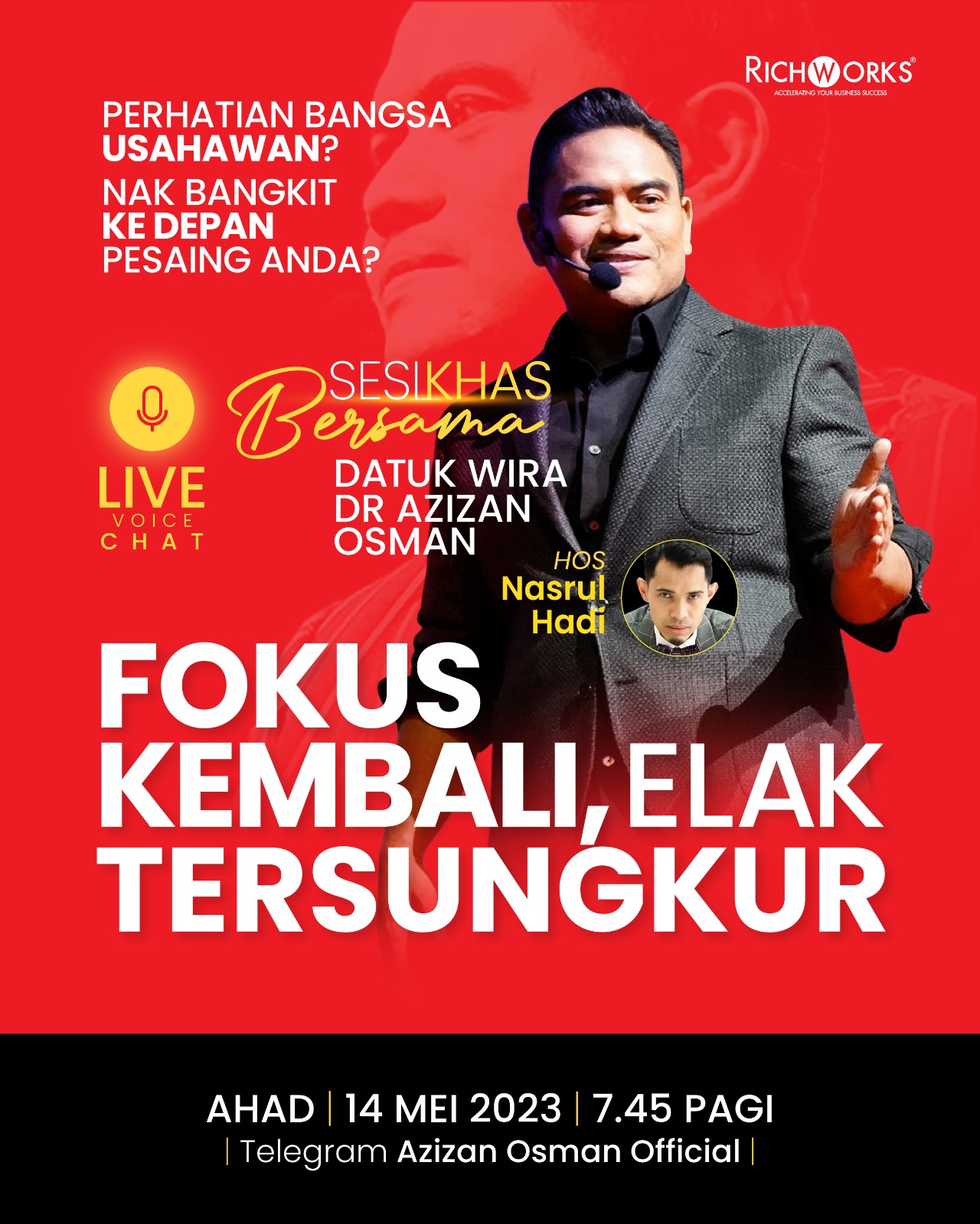 Salam sejahtera alluser, Melangkah ke dunia perniagaan, bererti setiap usahawan perlu bersedia untuk mendepani segala ujian. Bila buat bisnes biarlah terus berkembang dan memberi manfaat. Tingkah laku pelanggan berubah, jika kita terus leka dan tak peka, bisnes akan parah. Sebab itu kita tak boleh duduk dalam 'ketupat' terlalu lama. Mesti segera FOKUS dan segera comeback! Nak cepat dapatkan mood dan energy baru lepas raya? Jom kita luangkan sedikit masa dalam live voice chat sesi khas bersama Mentor Usahawan, Datuk Wira Dr. Azizan Osman yang akan mengupas topik Fokus Kembali, Elak Tersungkur. Selepas solat Subuh dan sarapan, kita terus tunggu sesi ini yang akan bermula pada 7.45 pagi (Ahad) di Telegram Azizan Osman Official. | |