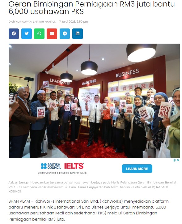 Selamat malam alluser, Sibuk melayan pelanggan ke pada hujung minggu ini? Moga segala urusan anda dipermudahkan dan mencapai target. Maaf mungkin anda terlepas, semalam Mentor Usahawan Jutawan, Datuk Wira Dr. Azizan Osman dah melancarkan geran bimbingan bernilai RM3 juta buat bangsa usahawan. Ia sempena dengan Klinik Usahawan: Siri Bina Bisnes Berjaya yang RichWorks adakan bermula Julai hingga September 2023, insya-Allah. Tapi ia BUKAN geran berbentuk wang ya, ia berbentuk latihan dalam Klinik Usahawan bersama pakar di mana alluser juga akan dapat sesi Penilaian Perniagaan + buku Perjalanan Satu Juta Pertama. Baca lebih lanjut dalam artikel ditulis Kosmo! online semalam ya>>> https://www.kosmo.com.my/2023/07/07/geran-bimbingan-perniagaan-rm3-juta-bantu-6000-usahawan-pks/ Jangan terlepas, anda juga boleh jadi antara 6,000 bangsa usahawan yang kami akan bantu nanti. Klik butang di bawah untuk mohon sertai Klinik Usahawan ini: | |
