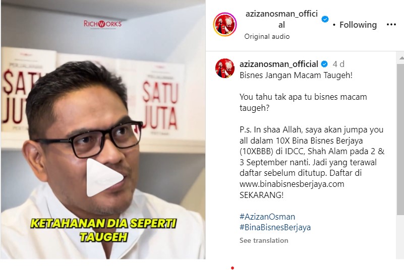 Saya doakan you kaya & berjaya, Datuk Wira Dr. Azizan Osman 12 HARI LAGI! Buat PENGUSAHA & PEMILIK BISNES. Pastikan miliki BOARDING PASS anda untuk ke 10X Bina Bisnes Berjaya.