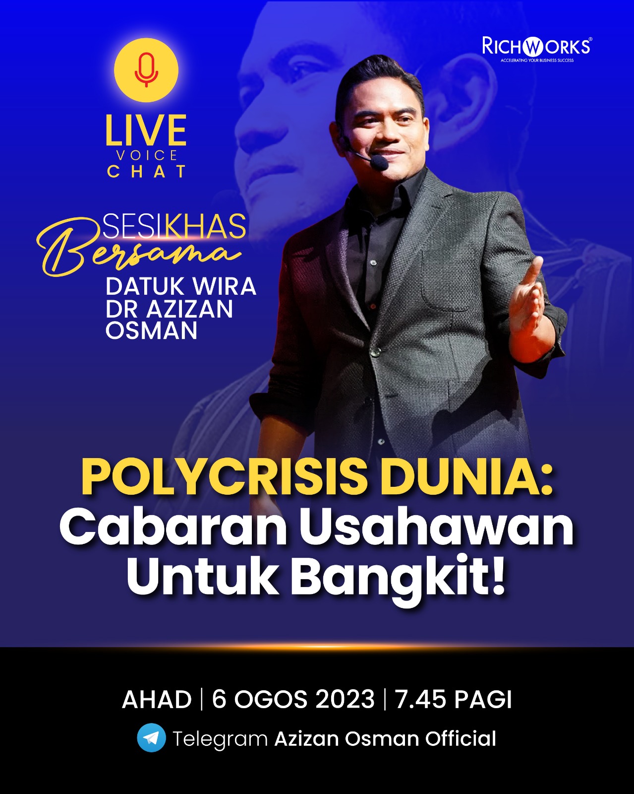 Salam hujung minggu alluser, Maaf ganggu hujung minggu you, tapi kami nak kongsikan peluang untuk you dapatkan INSIGHT PENTING daripada MenThor Datuk Wira Dr. Azizan Osman pagi esok (6 Ogos 2023)! Live Voice Chat, sesi khas bersamanya dalam Telegram Azizan Osman Official bermula jam 7.45 pagi. Beliau akan berkongsi mengenai "Polycrisis Dunia: Cabaran Usahawan Untuk Bangkit". Polycrisis bermaksud krisis-krisis yang berlaku 'serentak' dalam satu masa.