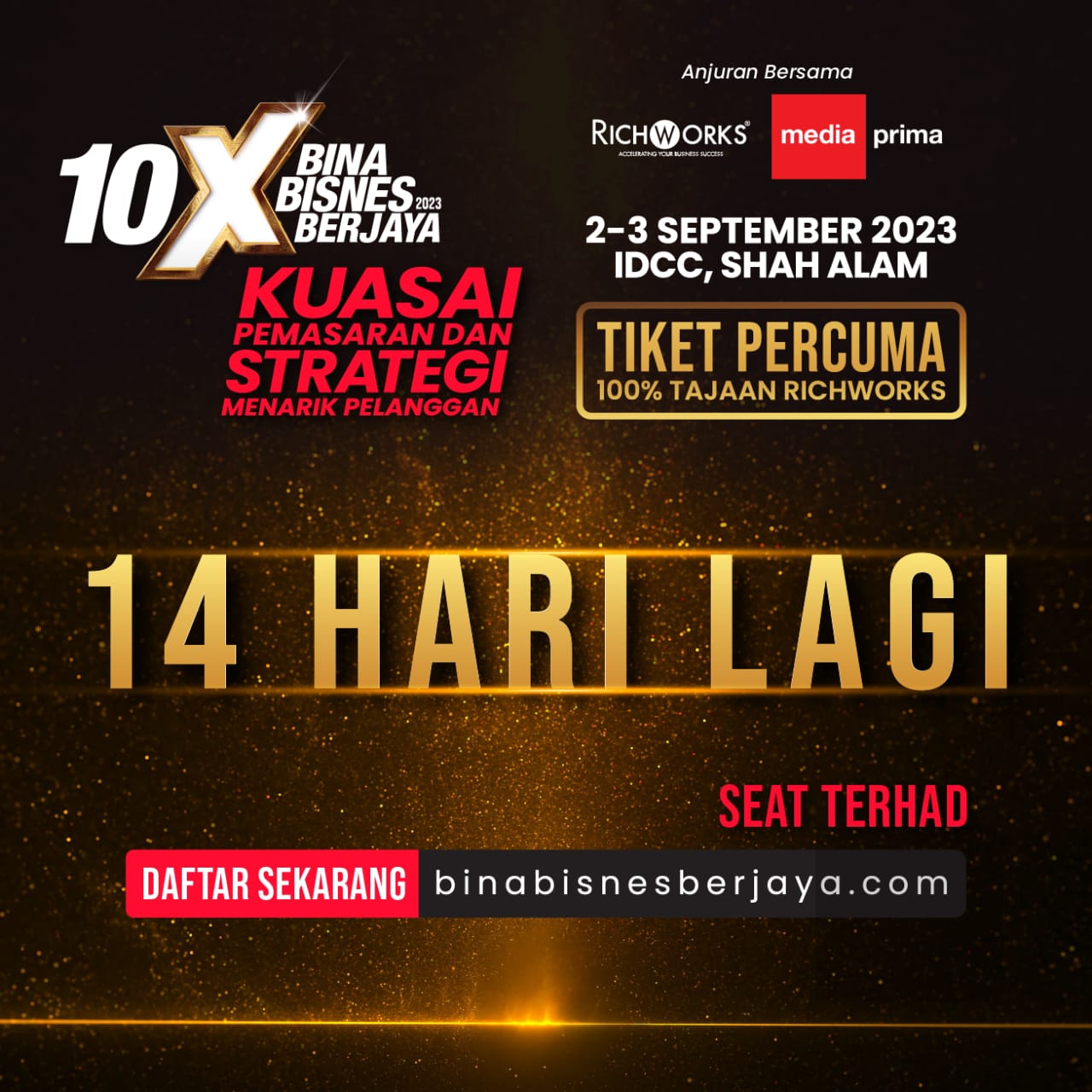 Salam hujung minggu alluser, Cuba bayangkan jika anda berada dalam situasi ini >>> Bukan sehari, bukan dua hari, bukan tiga hari, tapi dah berbulan-bulan tak ramai pelanggan masuk ke dalam kedai. Jualan online pun sendu je. Nak cover kos operasi bisnes hanya cukup-cukup. Jika ada pun lebihan sedikit, tapi ibarat 'kais pagi makan pagi, kais petang makan petang'. Sampai bila nak jadi 'penunggu' di kedai sendiri??? Sampai bila alluser nak hanya penat berbisnes tanpa hasil yang diimpikan? Setiap cabaran akan ada penyelesaiannya. Cari solusi untuk perbaiki masalah bisnes yang anda hadapi sebelum gulung tikar! Tinggal 14 HARI LAGI! Jika anda usahawan yang terkesan dengan krisis ekonomi yang sedang melanda, jangan fikir panjang untuk sertai program 10X Bina Bisnes Berjaya anjuran bersama RichWorks & Media Prima pada 2 & 3 September 2023 di IDCC, Shah Alam.