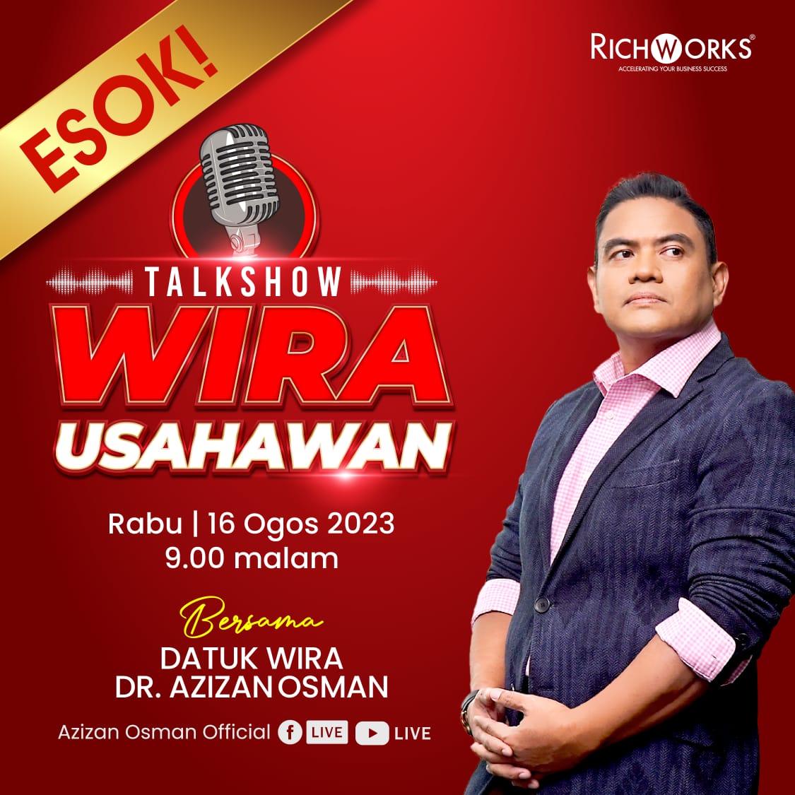 Salam alluser, Jika Marvel ada Superhero yang selamatkan dunia, RichWorks ada Wira Usahawan yang bakal selamatkan perniagaan anda! Siapa lagi jika bukan MenThor Usahawan Datuk Wira Dr. Azizan Osman. Mesti ada yang dah tak sabar nak berjumpa dengan beliau kan? Jika alluser sudah tak sabar nak berjumpa dengan Datuk Wira, jom jumpa dengan beliau dalam sesi Live Talkshow Wira Usahawan, ESOK, 16 Ogos 2023 di Facebook Azizan Osman. Apa yang nak dikongsikan? Sama-sama kita nantikan kerana pastinya sesuatu yang hebat untuk bangsa usahawan. Pejam celik kurang 3 minggu saja lagi untuk ke program 10X Bina Bisnes Berjaya (10XBBB) pada 2-3 September 2023 di IDCC, Shah Alam. alluser dah buat persediaan fizikal dan mental? Ini bukan seminar, tapi SOLUSI & JAWAPAN kepada cabaran usahawan saat ini! Bagi yang belum ada tiket, MOHON SEKARANG dengan klik butang di bawah. | |