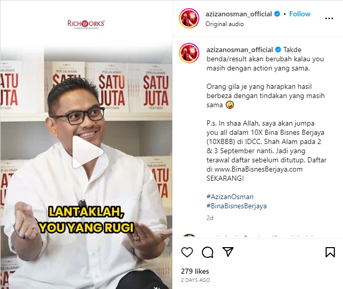 Salam sejahtera alluser, Strategi bisnes sentiasa perlukan perubahan dari semasa ke semasa. Tak ada benda akan berubah kalau you masih dengan action yang sama. Orang gila je yang harapkan hasil berbeza dengan tindakan yang masih sama… alluser nak dapat hasil yang berbeza dengan buat tindakan atau nak buat benda sama tapi tak ada apa-apa perubahan? Pilihan di tangan you sendiri. Tiada siapa boleh tolong, datang guru yang berkepak pun tak boleh nak buat apa-apa. Kalau you masih blur dan tak tahu nak buat keputusan, tonton video dengan klik gambar di atas sampai habis. Jangan skip! Insya-Allah, saya akan jumpa dengan usahawan dalam 10X Bina Bisnes Berjaya (10XBBB) di IDCC, Shah Alam pada 2 & 3 September 2023 nanti. Jadi yang terawal daftar sebelum platform ditutup. Tak perlu bayar apa-apa kerana tiket ditaja sepenuhnya oleh RichWorks. Tapi syaratnya, you adalah usahawan tak kira besar atau kecil perniagaan you. Mohon sekarang dengan klik butang di bawah. | |