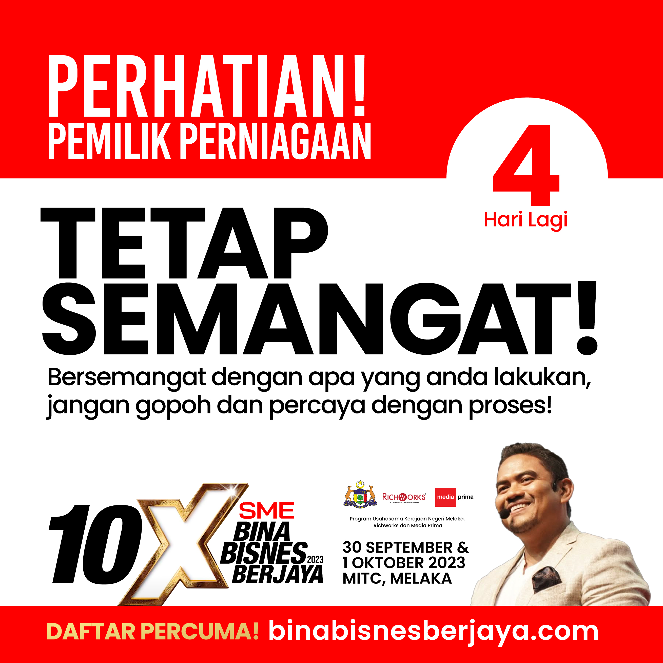4 hari sahaja lagi untuk ke 10X SME Bina Bisnes Berjaya.