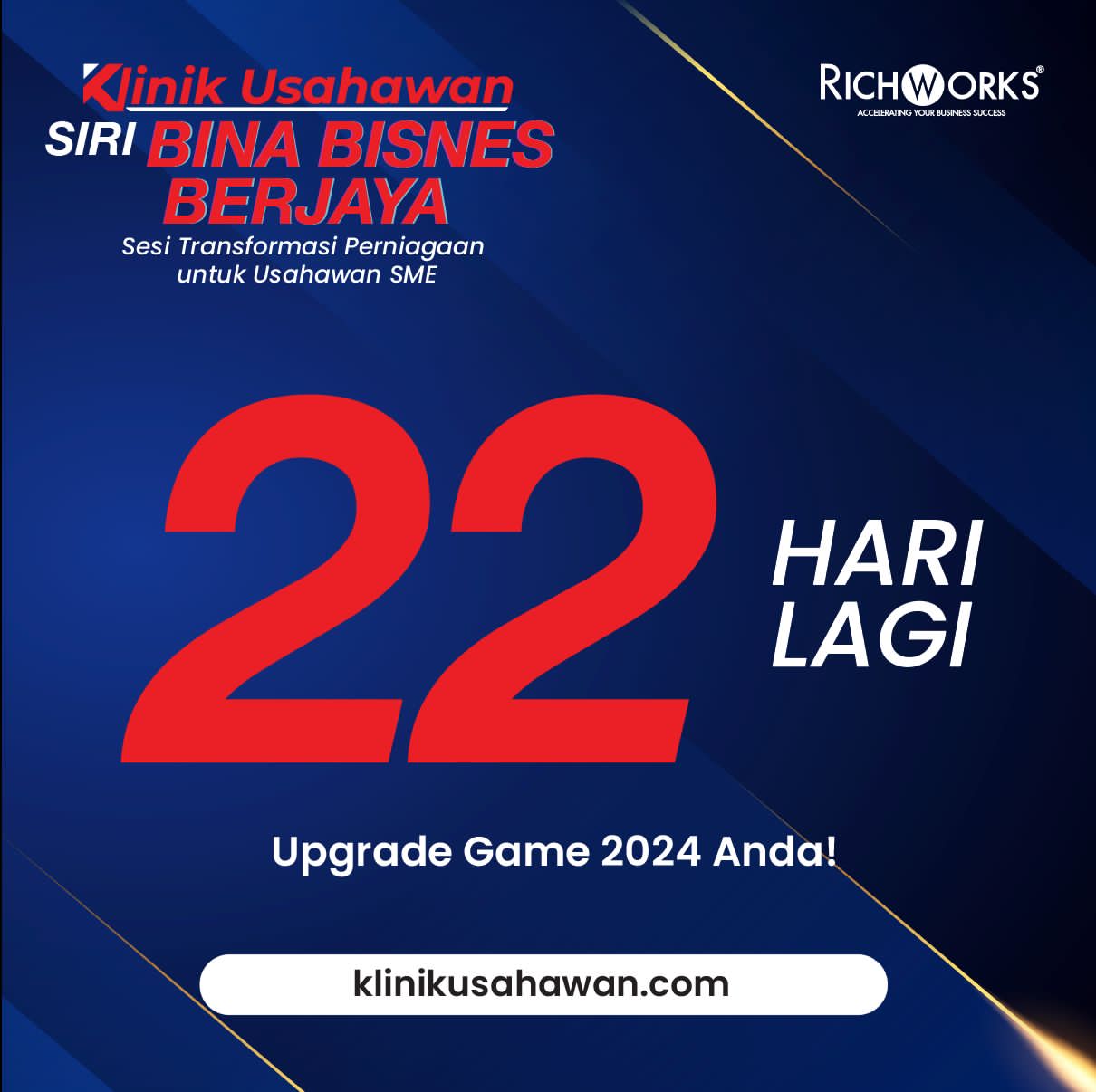 Selamat malam alluser, Masa tak menunggu kita, tinggal 22 hari saja untuk masuk ke tahun baharu. Senang atau susah, usahawan perlu harunginya dalam apa jua keadaan sekalipun. Bagaimanapun, alluser masih punyai pilihan untuk harunginya dengan lebih bersedia ataupun tetap mahu melakukan perkara sama meskipun tiada hasil seperti yang disasarkan sebelum ini. Mentor Usahawan, Datuk Wira Dr. Azizan Osman ada katakan ini bahawa 80% kejayaan datang daripada persediaan kita. Persediaan sangat penting alluser, lagi-lagi untuk usahawan berdepan 2024 yang dijangka lebih mencabar lagi. Jika 2023 ini anda rasa agak mencabar, 2024 nanti lebih lagi. Jangan abaikan soalan ini. Sebab itu, RichWorks dalam kesempatan 22 hari menjelang 2024 ini nak sokong anda untuk lebih bersedia. Kami nak jemput bangsa usahawan yang komited dan serius saja ke Klinik Usahawan: Siri Bina Bisnes Berjaya secara bersemuka dengan Expert & Business Consultant di pejabat RichWorks (RichQ). alluser dapat kenal pasti keadaan bisnes sebenar anda ketika ini, di samping mendapatkan solusi bagi cabaran bisnes masing-masing. Penilaian perniagaan bernilai RM497 akan dibuat secara percuma di samping hadiah buku kisah perjalanan usahawan mencapai jualan lebih RM1 juta bersama workbook 10X SME Bina Bisnes Berjaya buat anda yang hadir ke RichQ. Sesi ini tidak dilakukan dalam kumpulan yang besar, tapi ia dilakukan secara kecil agar dapat menjawab persoalan-persoalan bisnes anda. Eksklusif buat bangsa usahawan. Dapatkan slot anda sekarang dari Selasa hingga Jumaat pada waktu pagi atau petang dengan klik butang di bawah ini. | |