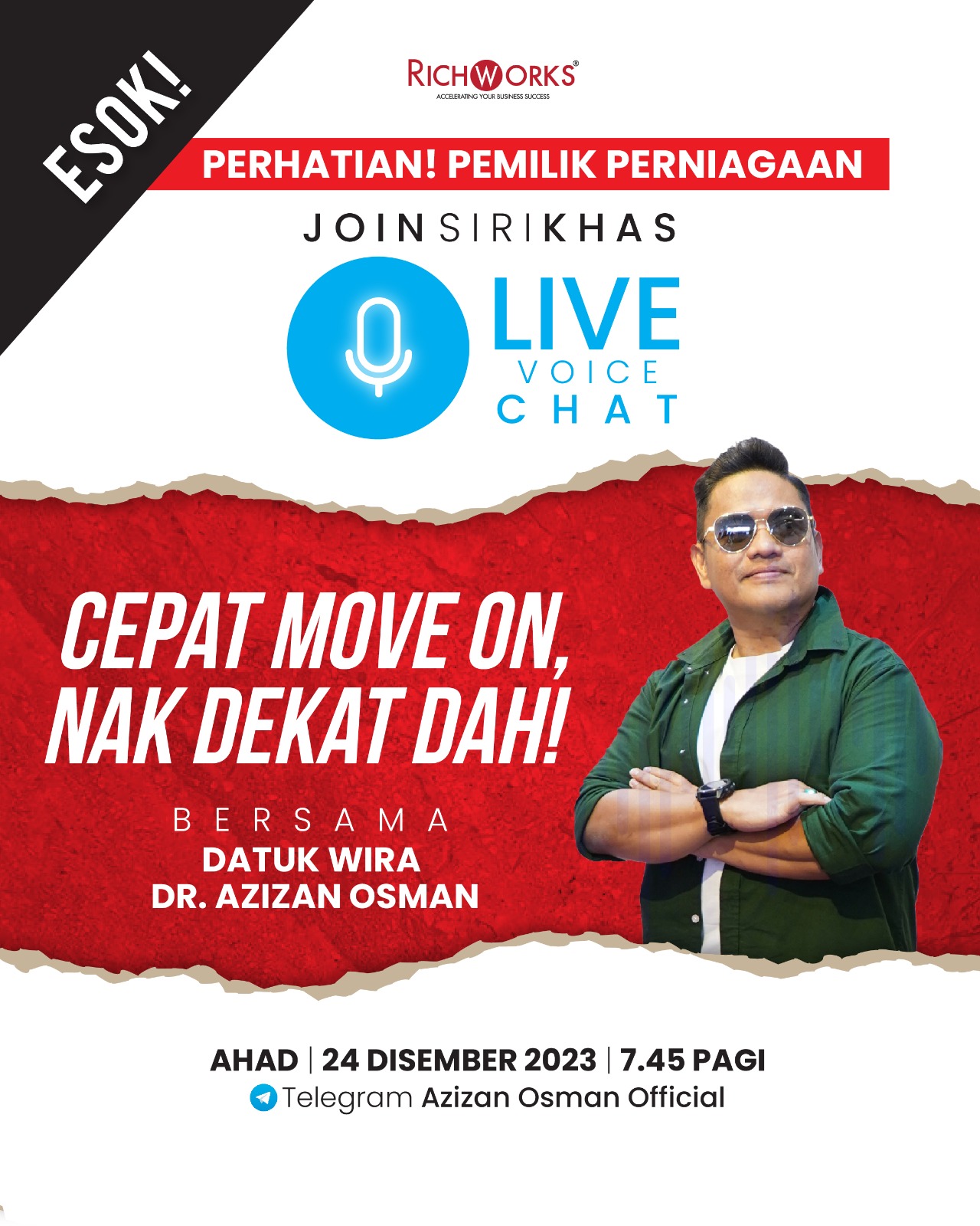 Selamat malam alluser, Selamat hujung minggu, pastinya ramai sedang bercuti atau ambil peluang balik kampung. Kami nak kongsikan satu lagi peluang untuk anda sebagai bangsa usahawan bagi mendapatkan input dan pandangan daripada Datuk Wira Dr. Azizan Osman untuk manfaat bisnes masing-masing. Jangan terlepas, ikuti perkongsian Live Voice Chat Dr. Azizan di Telegram Azizan Osman Official pada jam 7.45 pagi ini. Beliau nak sampaikan sesuatu buat bangsa usahawan menjelang tahun 2024 yang tinggal LAPAN hari saja. Rugilah kalau terlepas bagi persediaan bisnes you harungi 2024 yang dijangka lebih-lebih mencabar lagi. Pastikan you ajak rakan usahawan lain join Telegram Azizan Osman Official dengan klik butang di bawah ini. | |