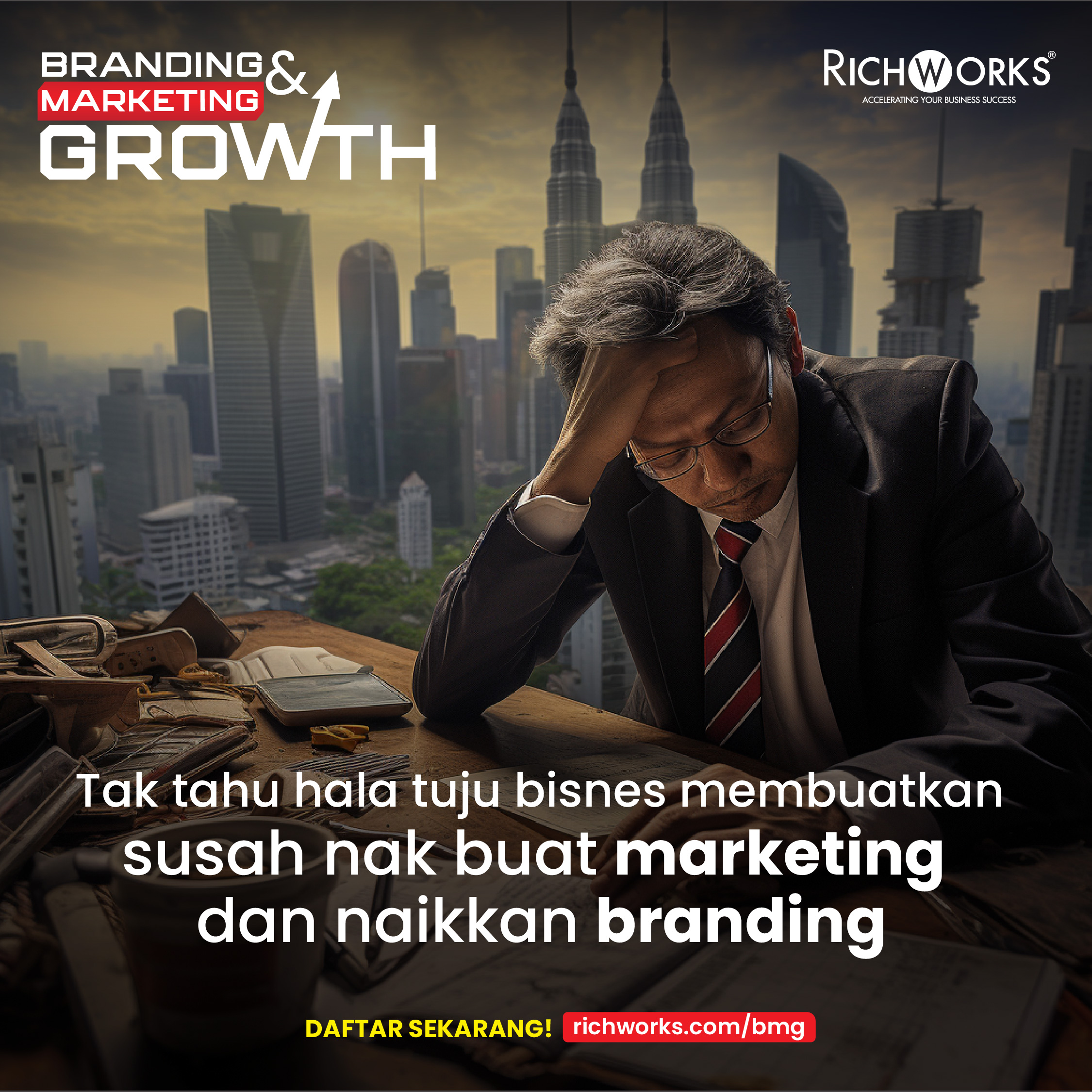 Kalau nak lebih faham, jom hadir ke sesi Branding & Marketing Growth (BMG) bersama Tuan Radz Mohd, Chief Business Officer RichWorks pada 3 Januari 2024 di platform Zoom. Beliau nak turunkan ilmu pada usahawan dan terangkan tentang Blueprint BMG 2024 yang anda akan turut dapat sebagai persediaan strategi bisnes 2024 dalam branding dan marketing serta 10 kali gandakan jualan raya tahun hadapan! | |