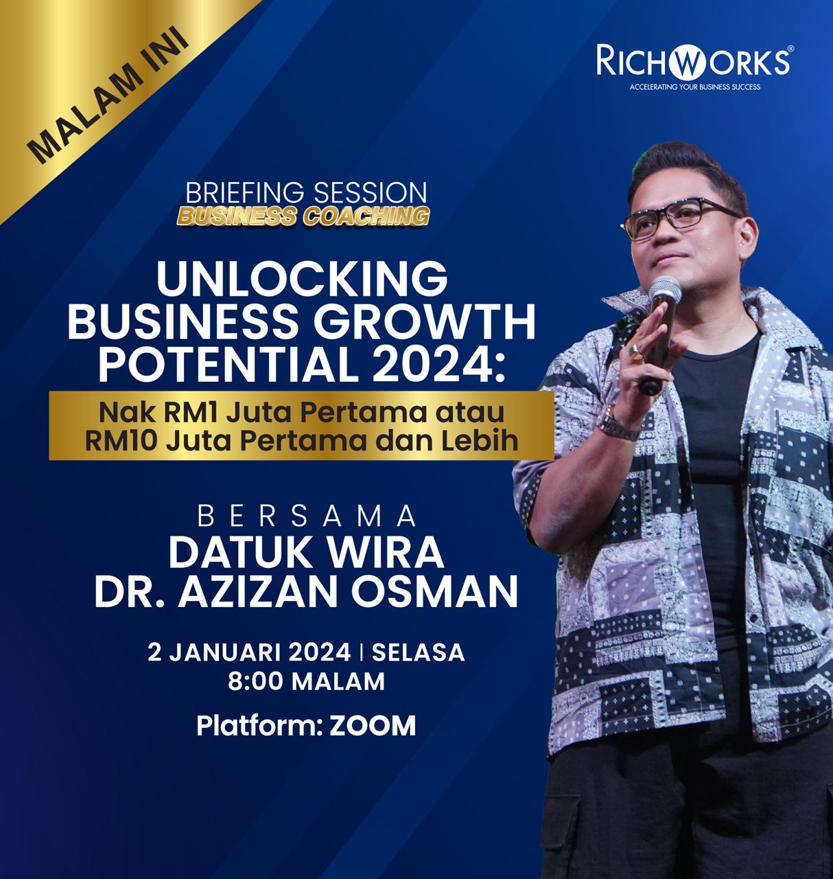 Hai alluser, Masih belum terlewat untuk kami ucapkan Selamat Tahun Baru buat anda! Apa impian anda untuk tahun ini? Pasti 'nak bisnes berkembang' menjadi salah satu daripadanya, bukan? Jika anda mahu meraih kejayaan dalam perniagaan yang diusahakan, maka anda tidak boleh terus kekal berada dalam zon selesa. Comfort zone is a big NO! Anda perlu terus mencari cabaran dan peluang baru untuk terus berkembang. Kehidupan di luar zon selesa akan membuka pintu kepada proses pembelajaran dan inovasi yang seterusnya bakal memberi lebih peluang untuk anda meraih jualan yang berlipat kali ganda seperti yang diharapkan. Oleh itu, kami di sini ingin membantu dengan membuka 'sebuah pintu' yang boleh dikatakan sebagai jalan pintas untuk anda mencapai cita-cita yang diimpikan bermula malam ini. Ya, jangan lepaskan peluang anda untuk mulakan sesuatu yang hebat pada MALAM INI, bersama dengan Datuk Wira Dr. Azizan Osman pada jam 8 malam secara Zoom dalam sebuah sesi istimewa. Cabaran tahun ini dijangka lebih dahsyat berbanding tahun sebelumnya. Sebab itu Dr. Azizan dan RichWorks benar-benar serius mahu membantu anda dalam menyediakan jalan yang lebih baik bagi mengharungi segala rintangan pada tahun ini. Perlu diingatkan, sesi ini hanya buat usahawan yang NAK dan ada KEMAHUAN untuk alami growth bukan saja capai jualan RM1 juta pertama bahkan RM10 juta pertama atau lebih lagi. Ini mungkin petunjuk yang anda nanti-nantikan selama ini! Bagi usahawan yang layak, anda berpeluang untuk ikuti sesi eksklusif secara bersemuka bersama Dr. Azizan di Lembah Klang pada 24 Januari nanti. Klik link ini untuk dapatkan akses Zoom anda! | |