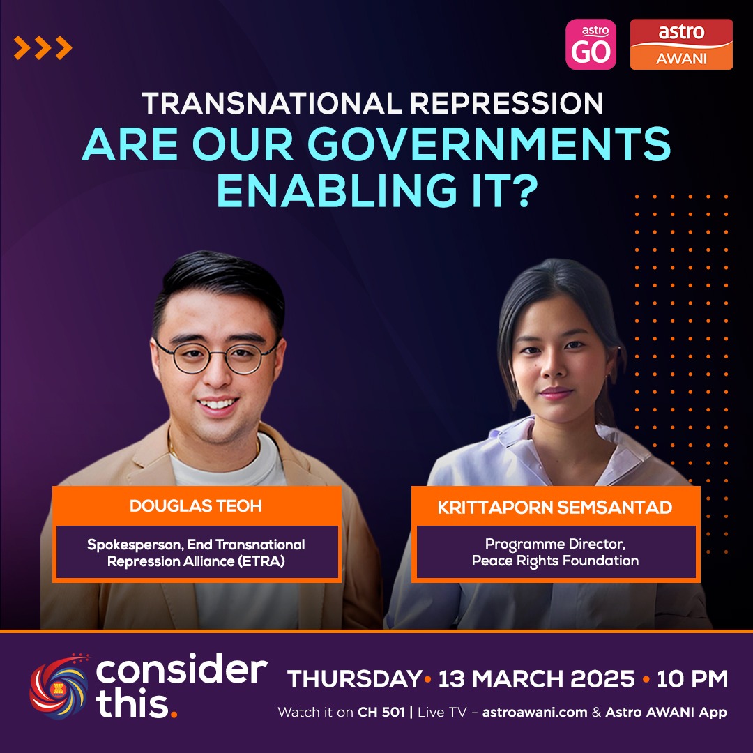 Dapatkan waktu berbuka, imsak, kalkulator zakat, artikel menarik Ramadan di sini | | | | | Authoritarian regimes don't stop at their own borders—often reaching across countries to track, detain, and deport refugees, activists, and migrants. This is transnational repression: when a state extends its repression beyond its own beyond their borders to control or punish its citizens abroad. Malaysia and Thailand, two of Southeast Asia's biggest hubs for migrants and refugees, have become key battlegrounds for transnational repression. With Malaysia helming ASEAN chair this year, what role does the region play in resisting, or enabling, transnational repression? On this episode of #ConsiderThis Melisa Idris speaks with Douglas Teoh, spokesperson from the End Transnational Repression Alliance, and Krittaporn Semsantad, Programme Director at the Bangkok-based Peace Rights Foundation. | | | | | |