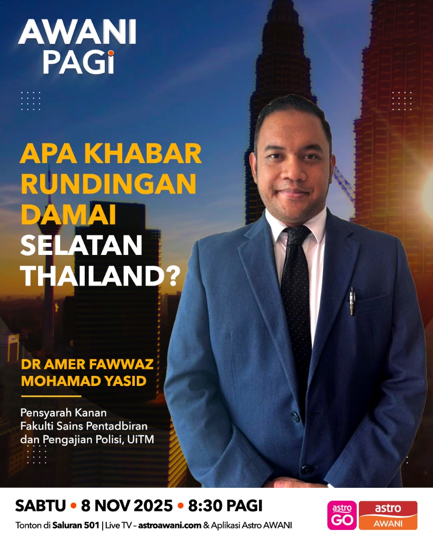 Dapatkan berita terkini di sini | | | | | Kerajaan Thailand berharap dapat menyambung semula rundingan damai di wiilayah Seatan tidak lama lagi selepas ia tertangguh seLama lebih setahun. Bagaimana Malaysia, sebagai fasilitator boleh berperanan menyahut hasrat Bangkok ini seterusnya mengembalikan keamanan di tiga wilayah bergolak. Kupasannya bersama Dr. Amer Fawwaz Mohamad Yasid, Pensyarah Kanan, Fakulti Sains Pentadbiran dan Pengajian Polisi, UiTM. | | | | | |