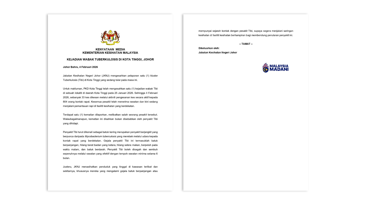 Satu kluster tibi dikesan di Kota Tinggi, 804 disaring, 33 positif - Dzulkefly; Virus Nipah: Saringan pengembara berisiko langkah proaktif cegah penularan; Lebih 100 terkorban dalam serangan kumpulan bersenjata di tengah Nigeria - Sumber