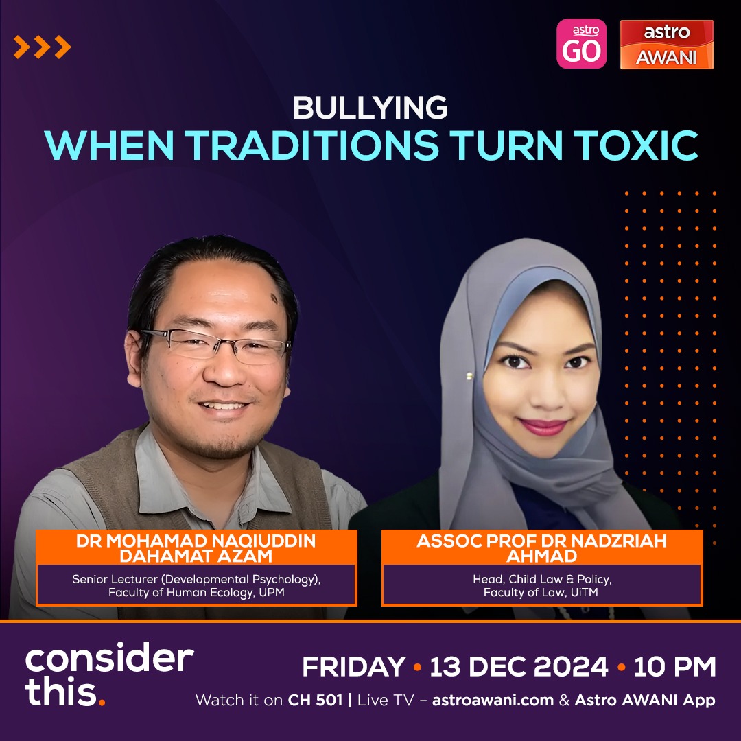 Dewan Rakyat has passed amendments to the Penal Code that criminalises all forms of bullying, including cyberbullying. This comes after several fatal bullying cases-- most recently at military academies—institutions often cloak harmful practices under the guise of traditions of discipline and character-building. Will this new law be enough to tackle bullying across such diverse contexts? On this episode of #ConsiderThis Melisa Idris speaks with Associate Professor Dr Nadzriah Ahmad, Head of Child Law & Policy at UiTM's Faculty of Law, and Dr Mohamad Naqiuddin Dahamat Azam, Senior Lecturer at UPM's Faculty of Human Ecology.