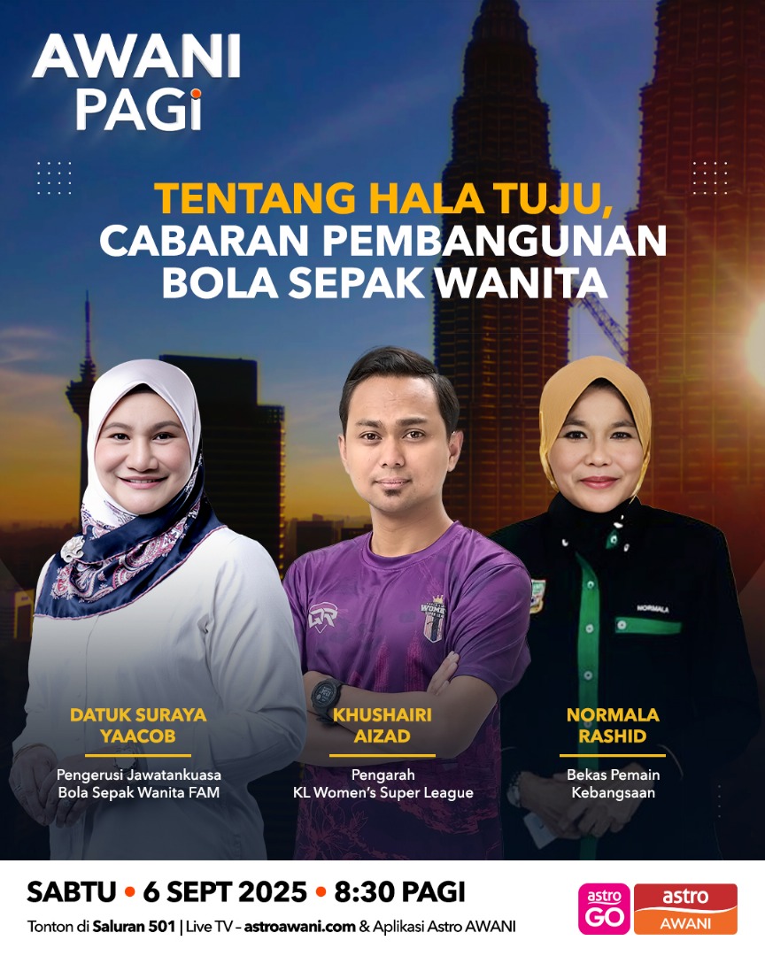 Raikan Hari Kebangsaan dan Hari Malaysia dengan kempen Inilah KITA di sini | | | | | Diskusi #AWANIpagi bersama tiga tetamu, Datuk Suraya Yaacob, Pengerusi Jawatankuasa Bola Sepak Wanita FAM; Khushairi Aizad, Pengarah KL Women's Super League dan Normala Rashid, Bekas Pemain Kebangsaan membincangkan banyak aspek tentang bola sepak wanita khususnya berkaitan hala tuju serta cabaran pembangunannya di negara ini. | | | | | |